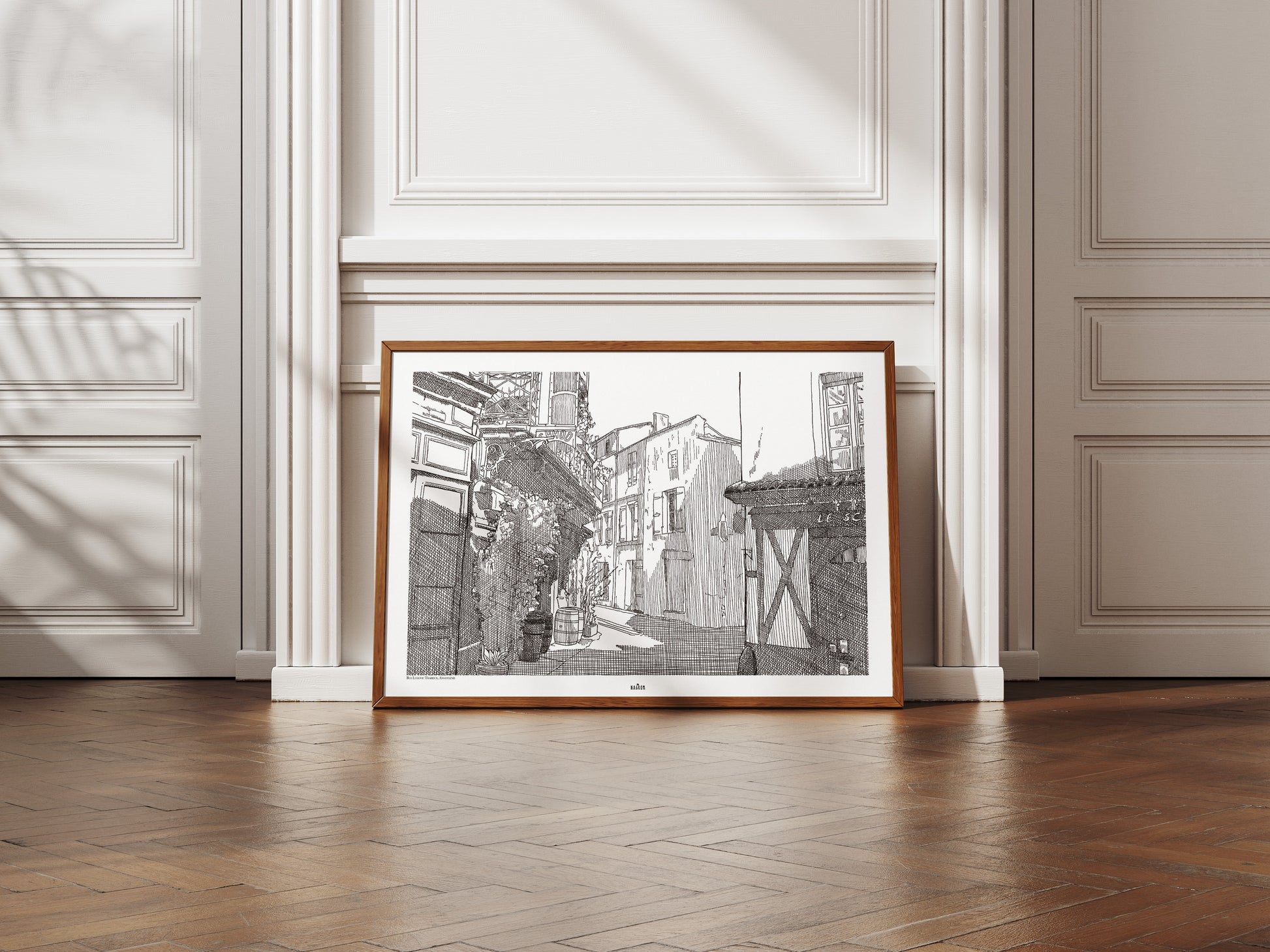 illustration de la petite rue Ludovic Trarieux où se croisent différents bars, salon de thés, restaurants et commerces.