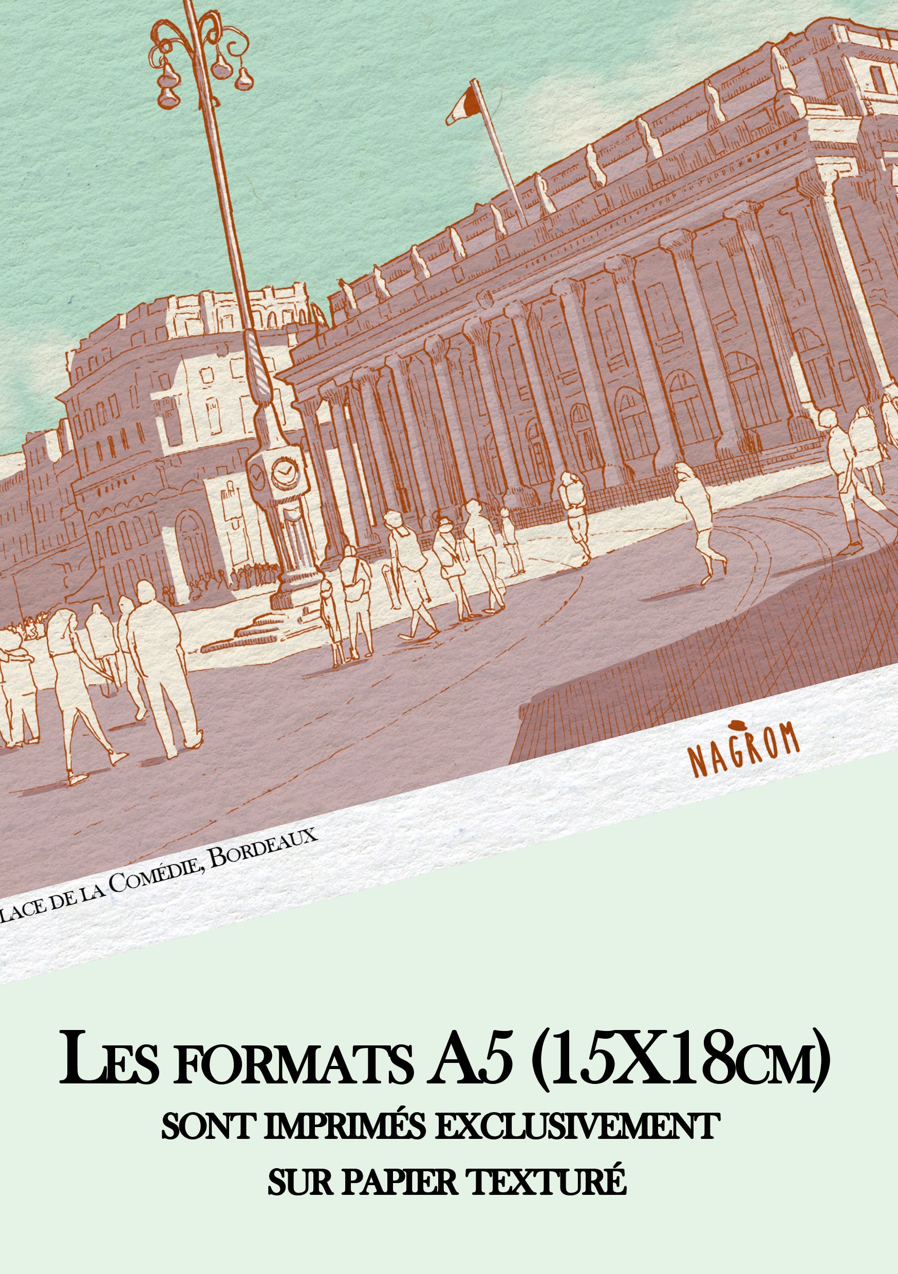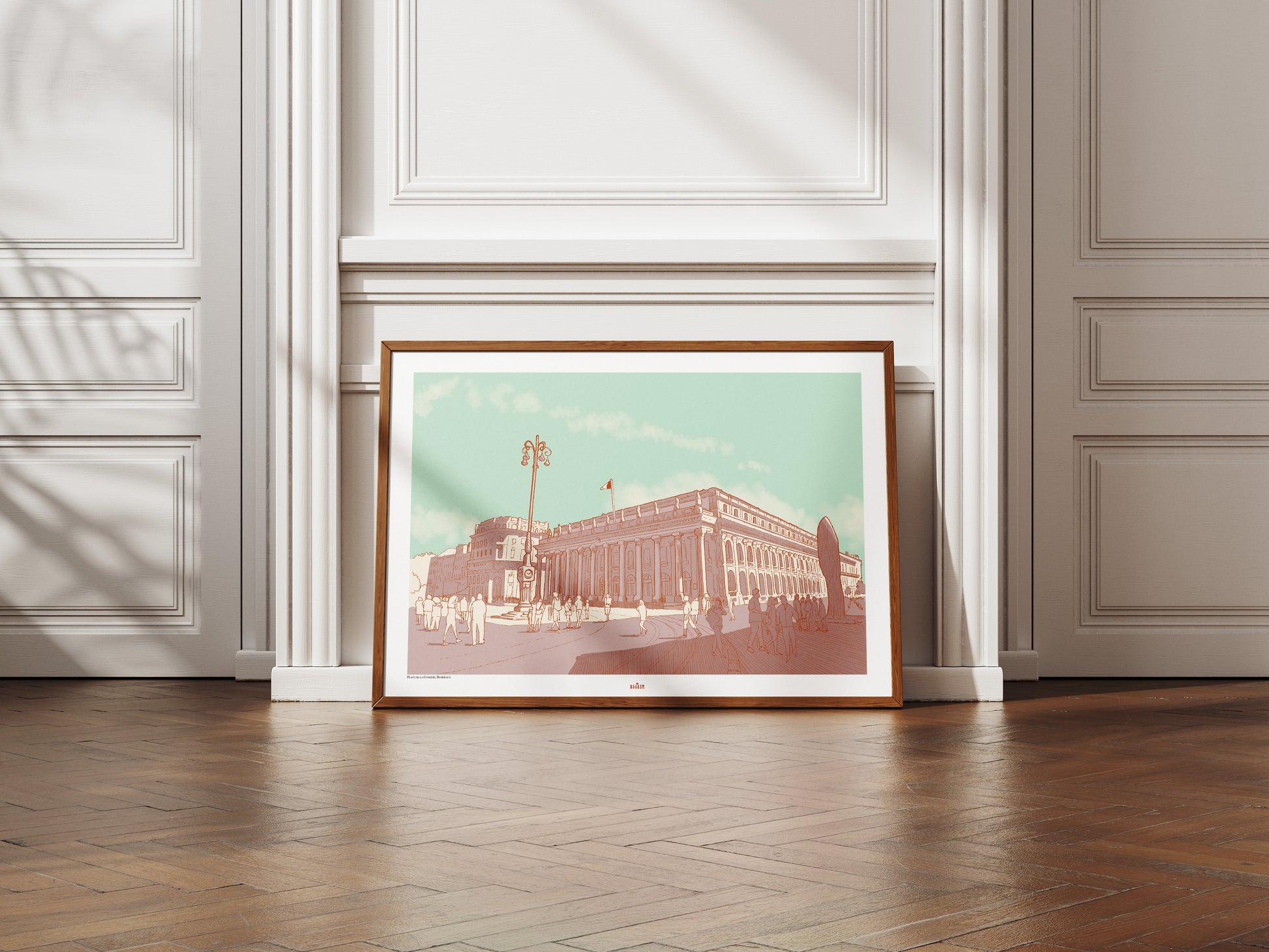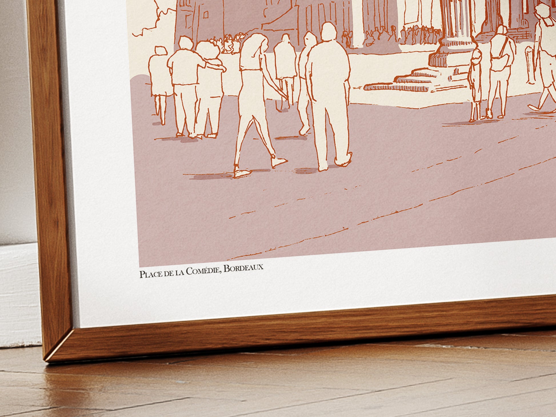 Illustration de la Place de la Comédie et du majestueux Grand-Théâtre qui fût conçu par l’architecte Victor Louis et inauguré en 1780. Ce chef-d’œuvre néoclassique impressionne par ses douze colonnes corinthiennes et ses 12 statues dominant la façade (neuf muses et trois déesses des mythologies Gréco-Romaines).