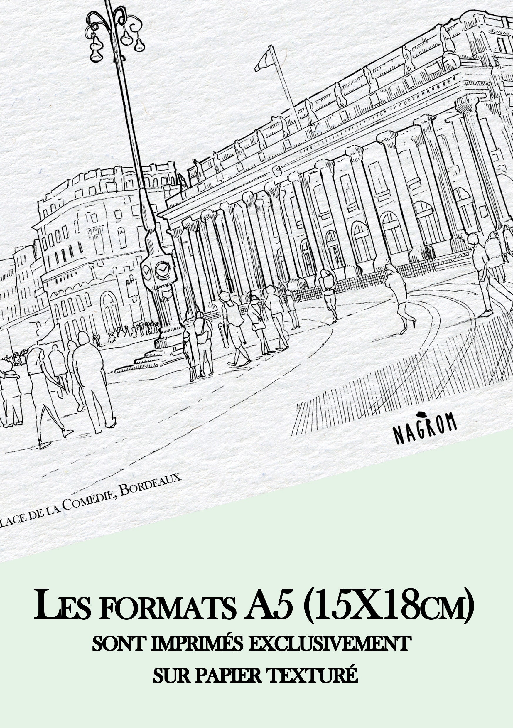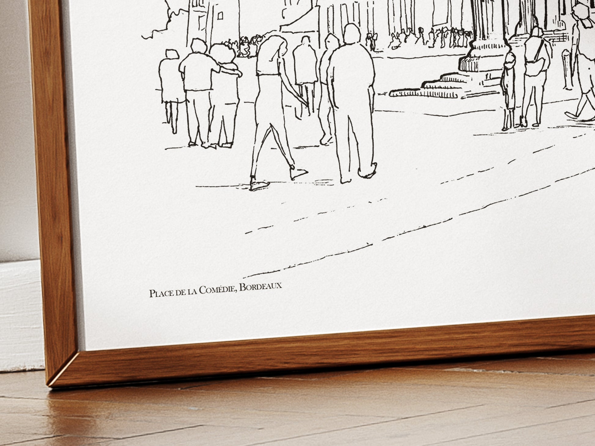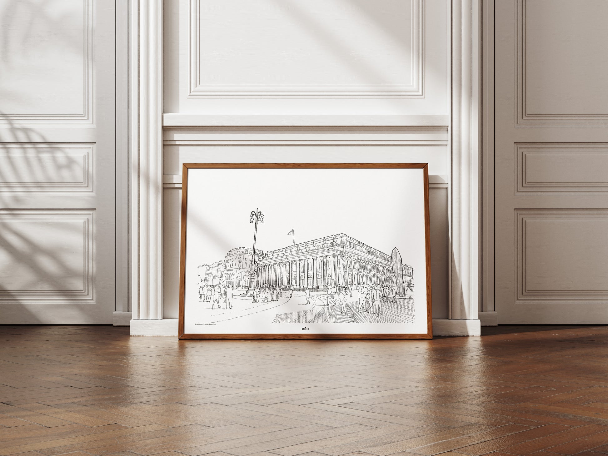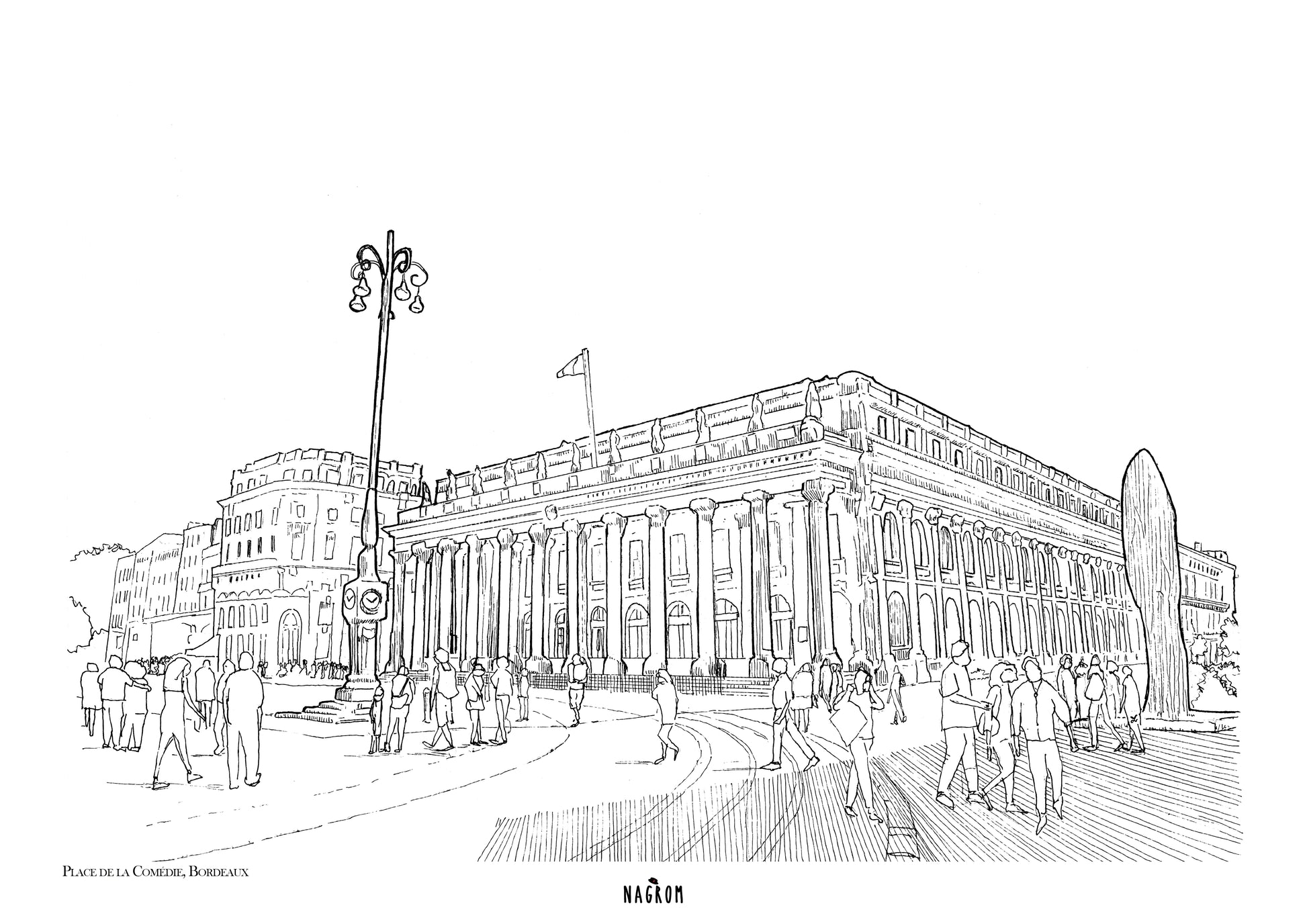Illustration de la Place de la Comédie et du majestueux Grand-Théâtre qui fût conçu par l’architecte Victor Louis et inauguré en 1780. Ce chef-d’œuvre néoclassique impressionne par ses douze colonnes corinthiennes et ses 12 statues dominant la façade (neuf muses et trois déesses des mythologies Gréco-Romaines).
