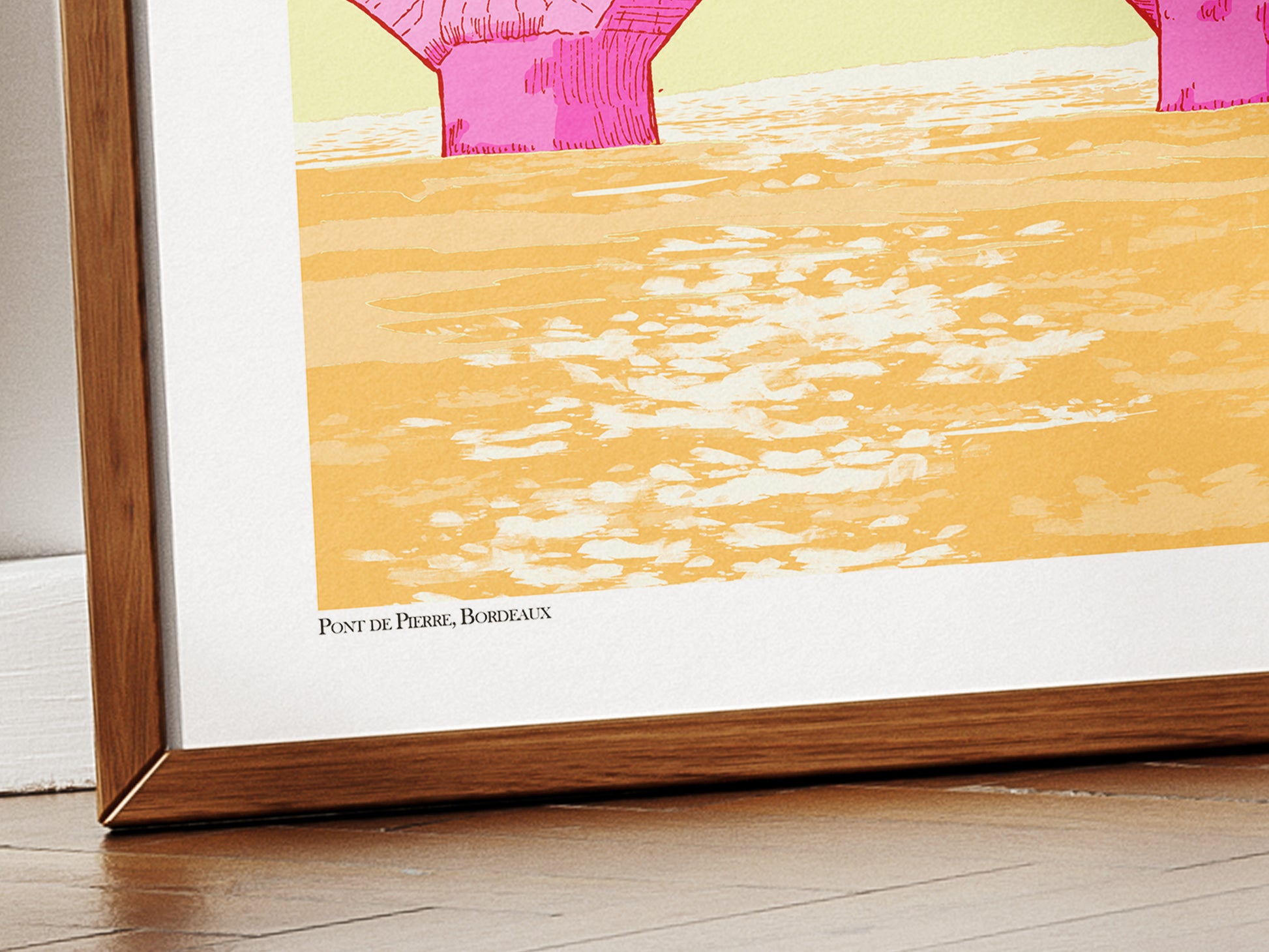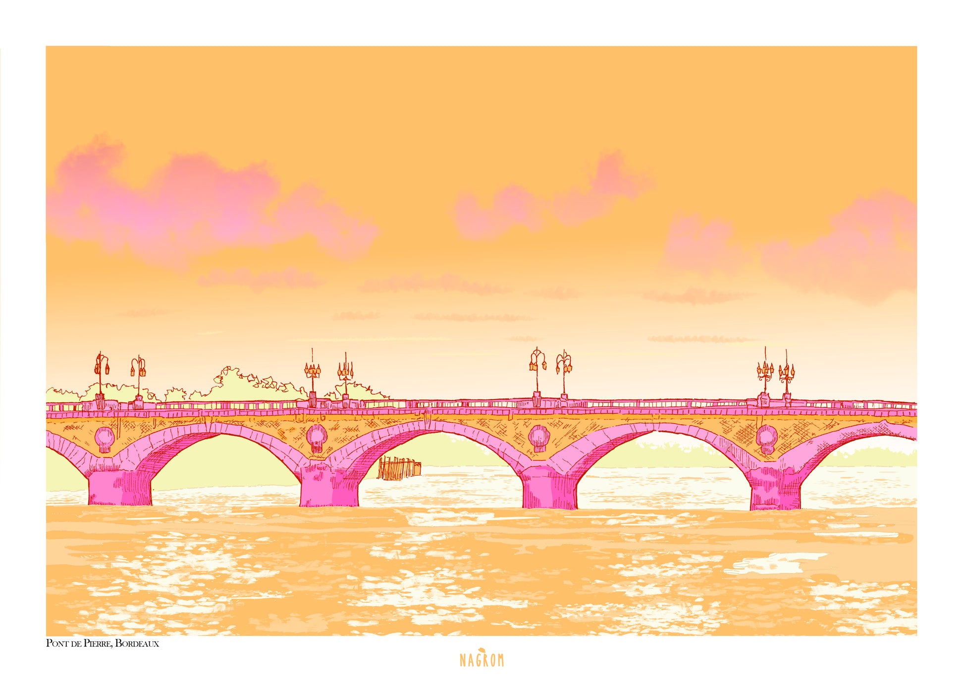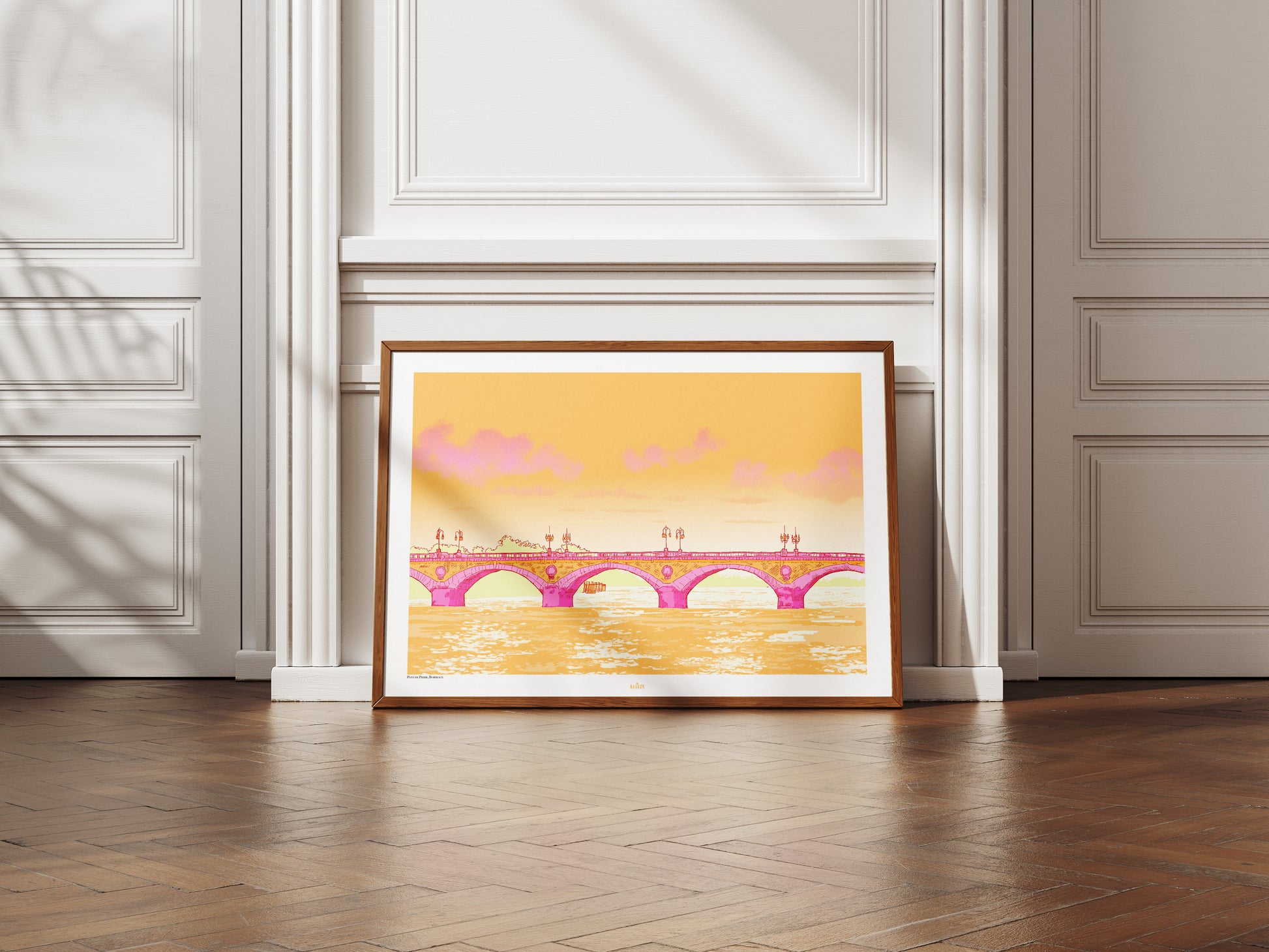 Illustration de ce pont emblématique du XVIIe siècle. Composé de 17 arches élégantes, il enjambe le fleuve de la Garonne. Symbole de Bordeaux, il relie les deux rives de la ville offrant ainsi une vue imprenable sur les quais de la ville.