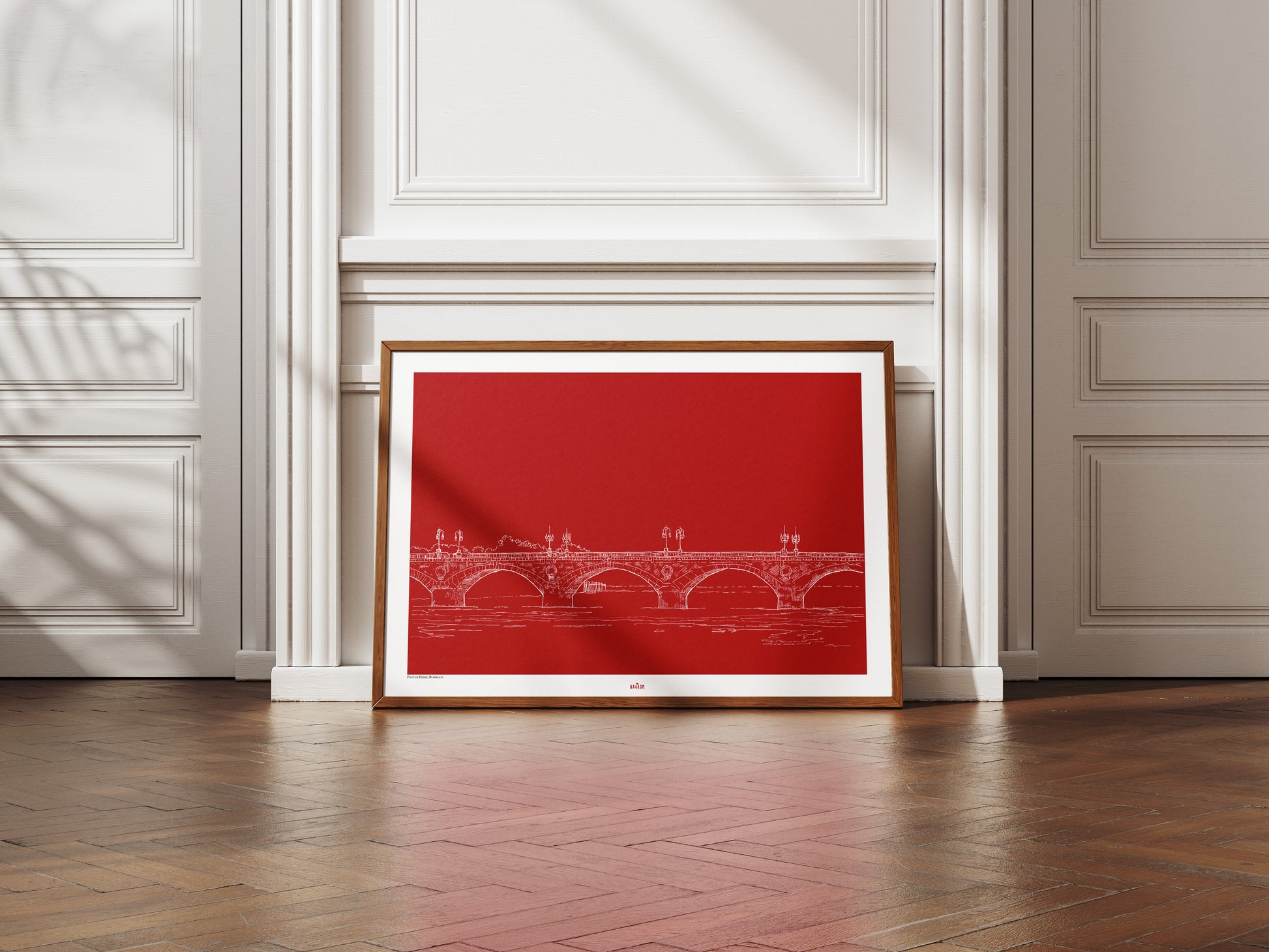 Illustration de ce pont emblématique du XVIIe siècle. Composé de 17 arches élégantes, il enjambe le fleuve de la Garonne. Symbole de Bordeaux, il relie les deux rives de la ville offrant ainsi une vue imprenable sur les quais de la ville.