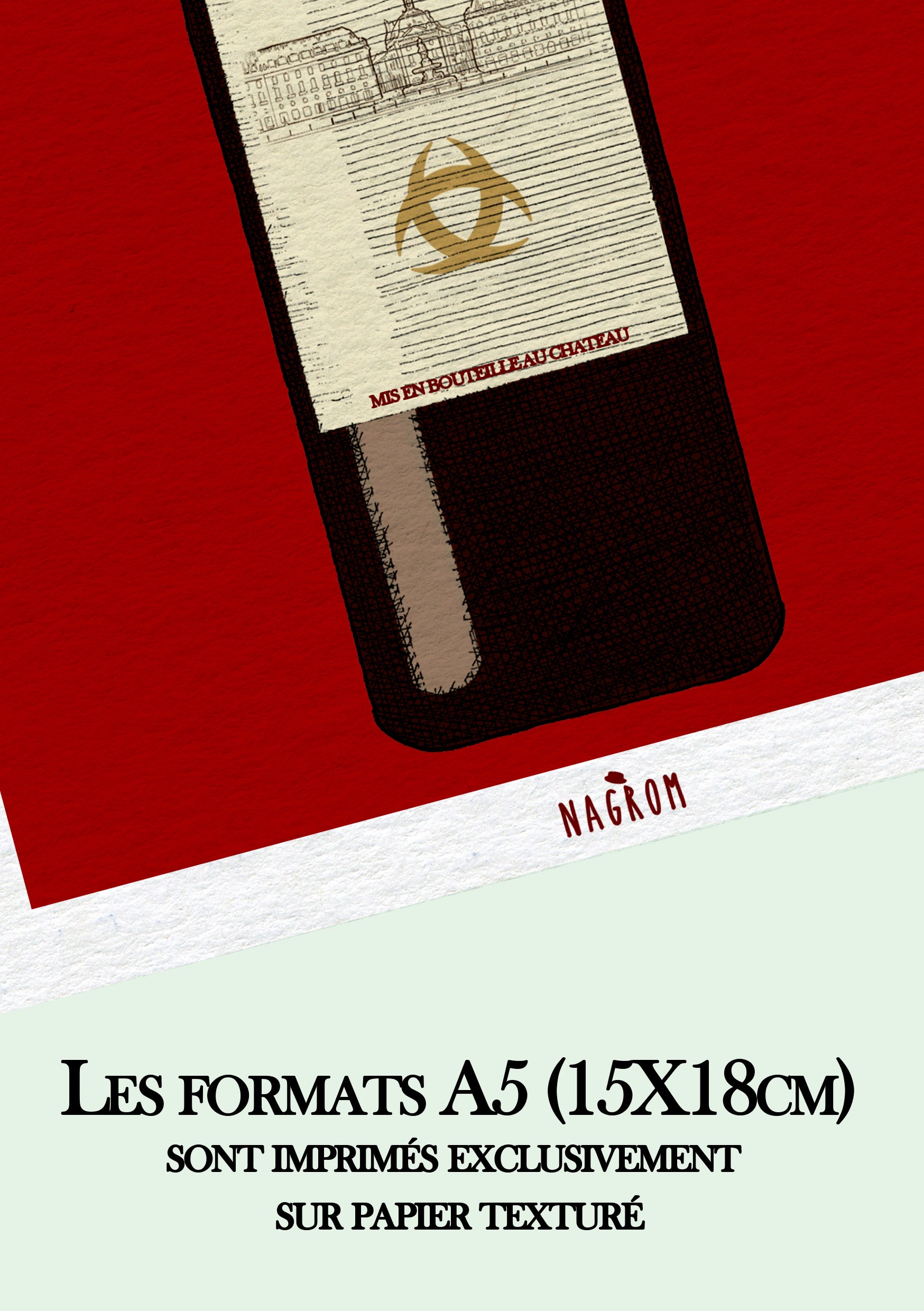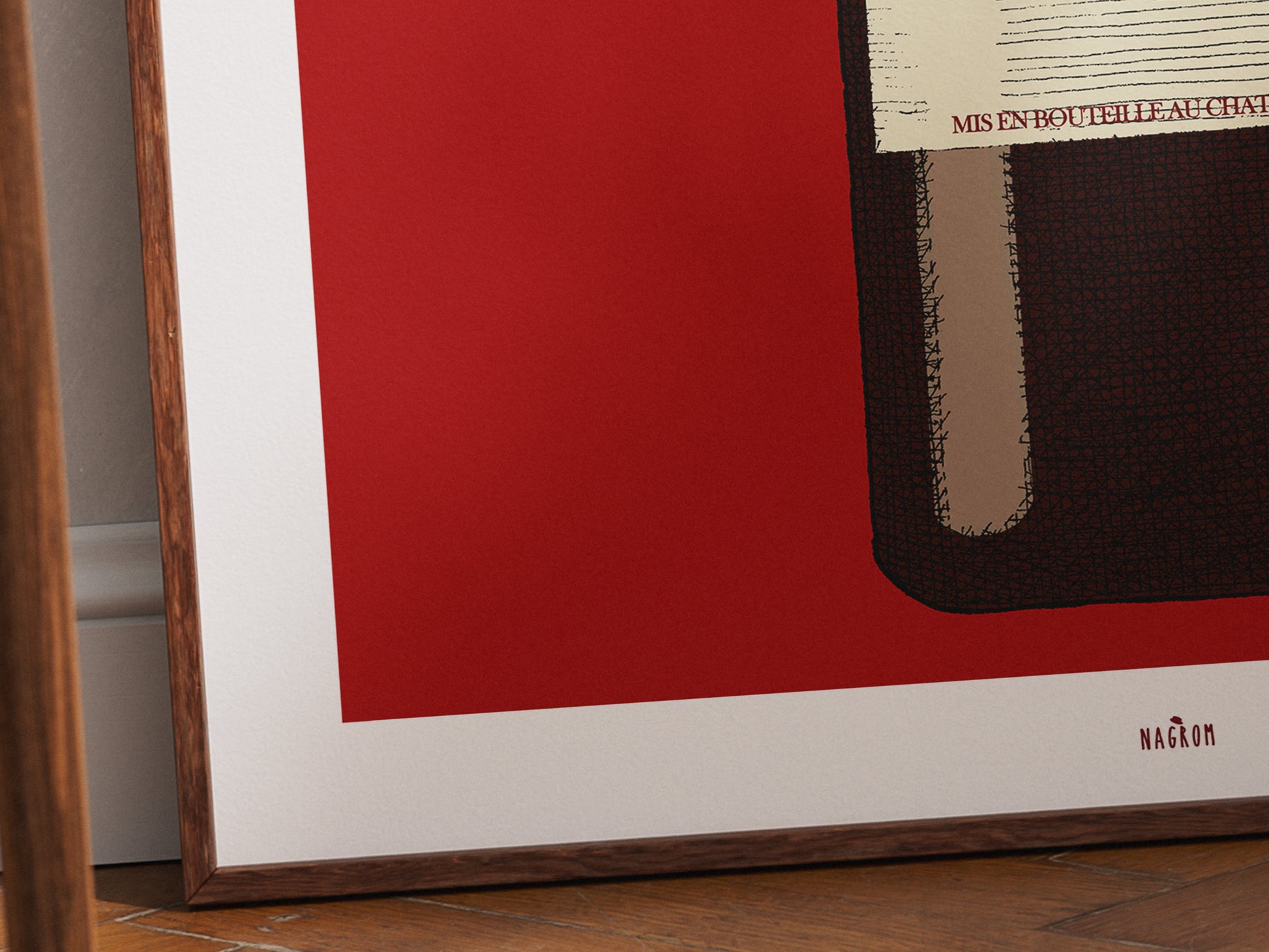 Illustration stylisée d'une bouteille de vin bordelais sur un fond rouge profond, évoquant les vignobles ensoleillés et l'art de vivre à la française. L’étiquette, ornée d'un dessin de la Place de la Bourse et du sceau doré de la ville, capture l’élégance et l’héritage viticole de la région, idéale pour décorer avec une touche d’urbanité raffinée.